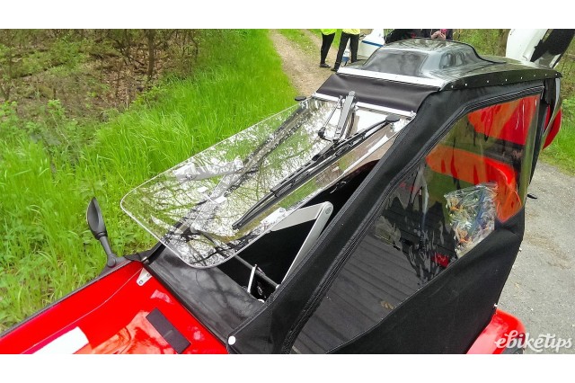 The lack of any weatherproofing was one of the major bugbears of the C5 when it launched, and it wasn't really helped by Sinclair offering a range of waterproofs to keep you dry. The Cabriovelo – the clue's in the name here – is convertible. So if it's raining, you can stay properly dry. Ventilation could be an issue if the sun comes out after the rain, so the windscreen (with wiper) is hinged to allow good airflow if you need it.