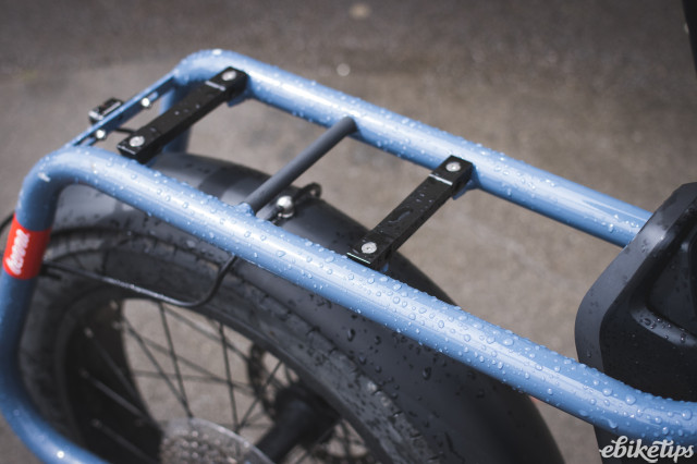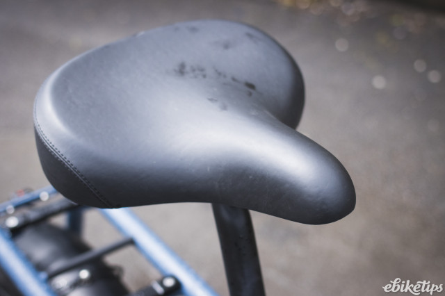 The steel frame is neat and stylish, with a low step-through that makes the bike easy to get on and off. The rear rack is integrated into the frame; the large-diameter tubes mean that you’ll need an adapter to fit a standard pannier, but you can also bolt on a lot of other stuff: a Yepp child seat, a cargo rack for a standard crate, or even an insulated box for deliveries. Anything that uses the RackTime standard should fit; the RemiDemi will even work with a Carver surfboard rack. There’s a front rack mount on the head tube too. The maximum rated capacity of the bike is 180kg, and that includes the 30kg of bike weight, so a 90kg rider like me could load the front and rear racks to their 20kg/30kg capacity and still have 10kg to spare. The maximum rider weight is 120kg.