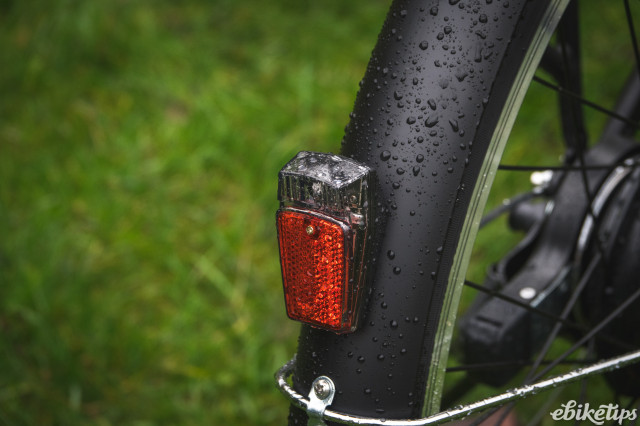 There’s a horn, too, as well as a button for the lights. Well, light: the front is powered from the motor system while the rear is battery-powered. Gearing is Shimano’s 6-speed Tourney system, which is pretty easy to use although the gear range is reasonably limited.