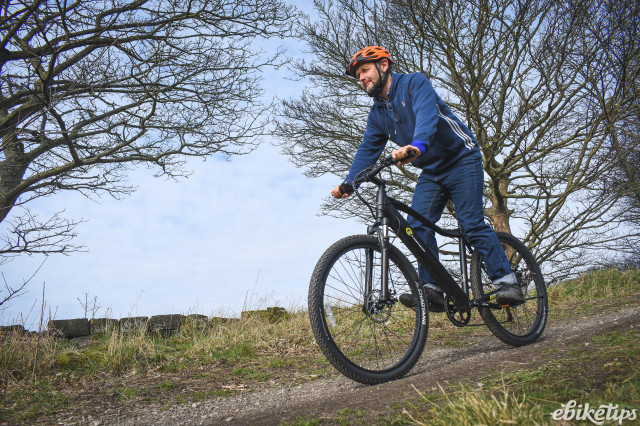 The bike is nice to ride without power, with a free-running freewheel and light feeling wheels. The fork felt unnaturally stiff but I actually preferred it to many other budget sprung forks which can be ‘clanky’ and a little loose feeling. It would be better to have a light alloy fork though to save weight – the only real benefit I get from such cheap forks is when going over larger dropoffs like curbs. The cable-operated disk brakes had a decent amount of stopping power, even if they felt a little spongy compared to others I have tried. The tyres were nice and grippy and a joy to use on trails and appear to have some form of puncture protection, branded as 'shark skin'.