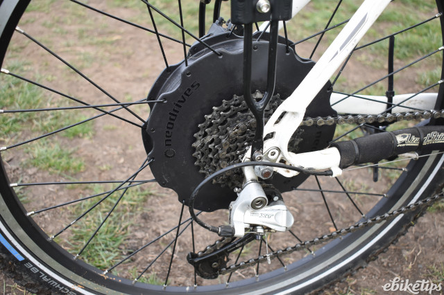 I was dreading fitting. Most kits are front hub motor designs because of the potential problems of rear hub kits to do with gear and brake compatibility and chain alignment. However, the Ebikeoutlet Neodrives wheel came ready fitted with a nine sprocket cluster and after fitting the disc rotor and tyre off the Marin to the new motor wheel, it slotted straight into the frame like a dream. No fettling was needed on disc alignment or on gear indexing and axle spacing within the frame. Maybe I was lucky but certainly the 26" wheel kit looks to be made very accurately indeed.
