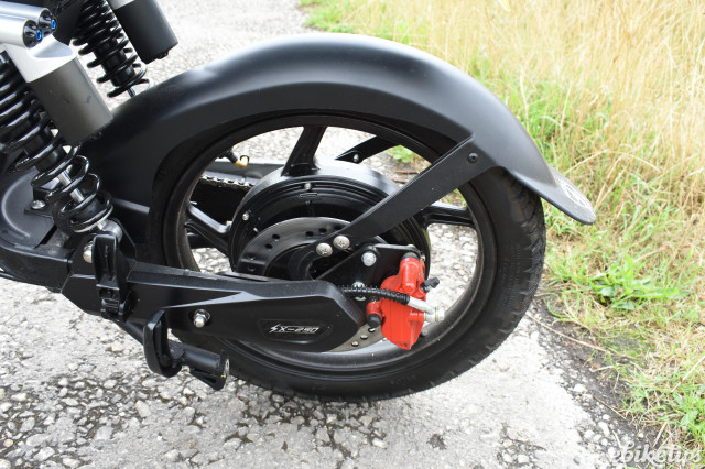 The four-pot, dual padded hydraulic disc brakes mean even with all that weight you feel very secure as you will stop both quickly and smoothly. This applies when you have the extra weight of a pillion passenger on too. Indeed, we found the Eskuta X250 one of the best e-bikes we've tested for taking a smaller pillion rider with you.