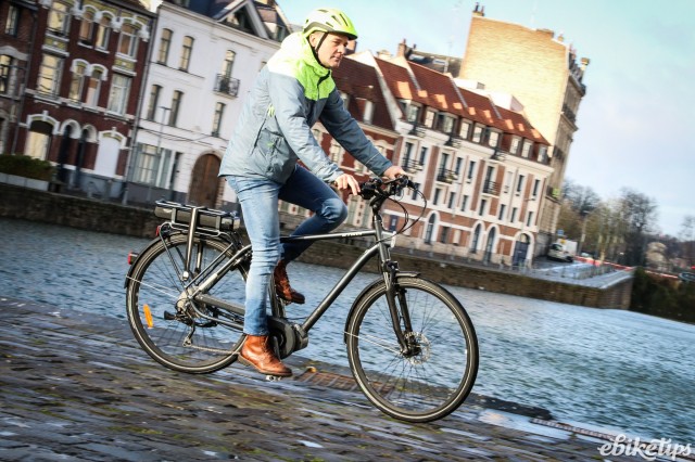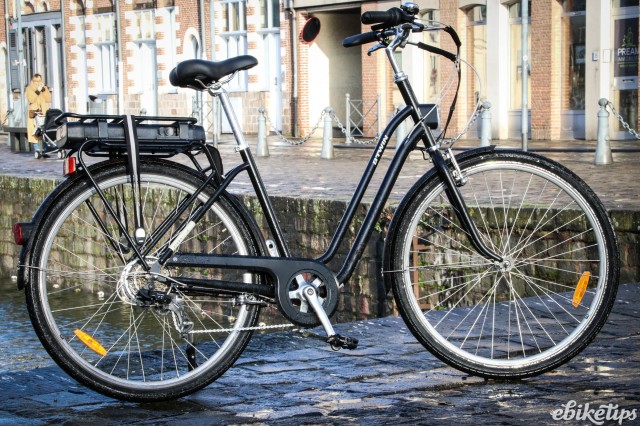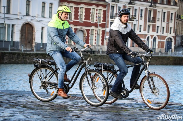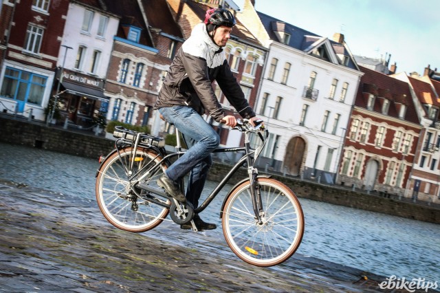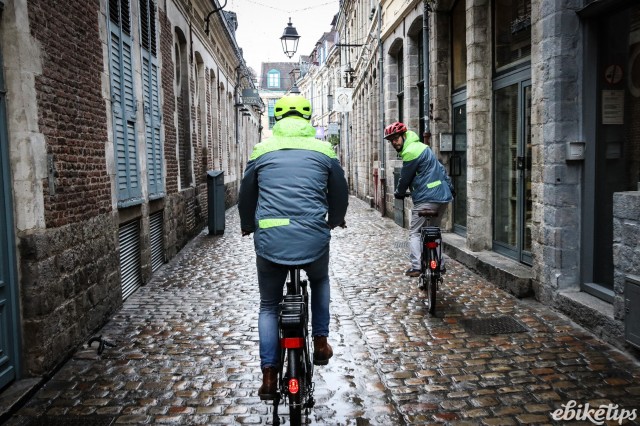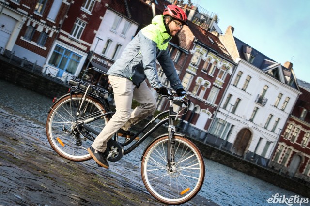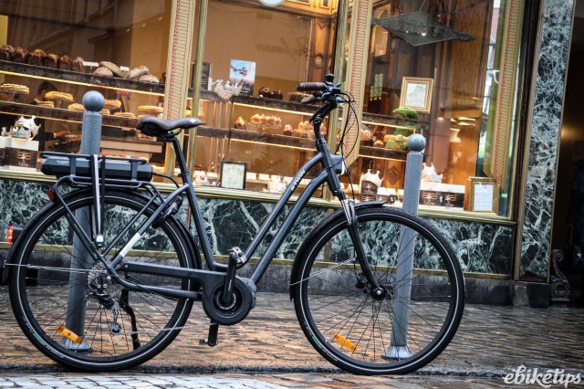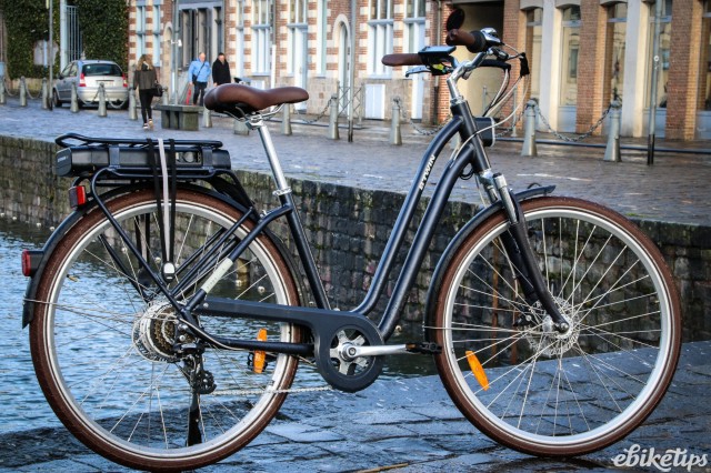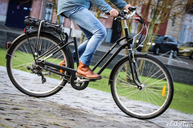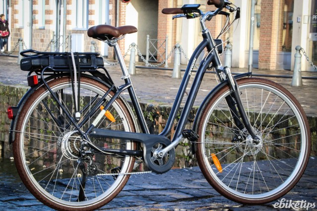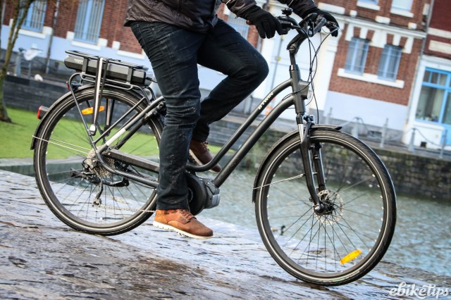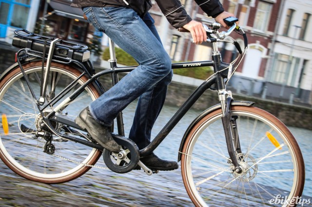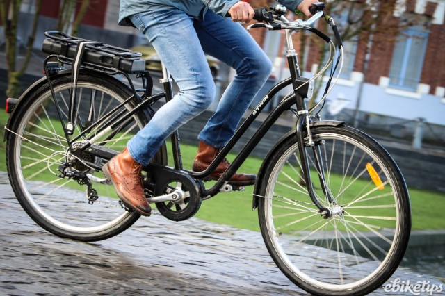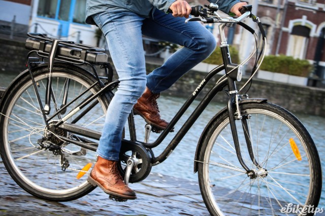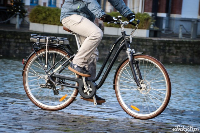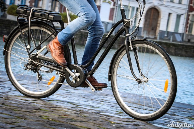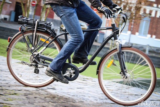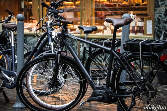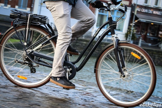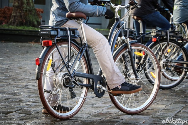 The elops 940e felt very composed on the Lille streets. The better weight distribution that you get from having the motor in the middle of the frame was apparent, making the bike feel less back-heavy and more stable. The cheaper hub-motor bikes are by no means bad in that regard, but this bike was the best in terms of the feel of the ride. Both the elops 940e bikes we were riding had Selle Royal saddles but pretty much everyone agreed that the cheaper own-brand saddle on the other two models was actually more comfortable, so production bikes may come with that.