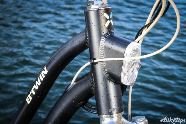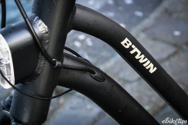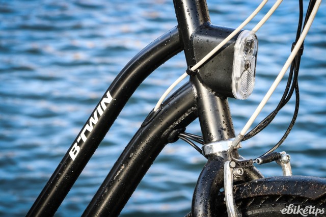 All of the three new bikes in the B'Twin e-bike range are available either as a step-through or a diamond frame. To save money in production the elops 500 uses steel instead of alloy for the frame and fork, and is available in one size only. One thing that the three bikes share is an integrated light built into the head tube of the frame, with a rear light integrated into the rear mudguard.