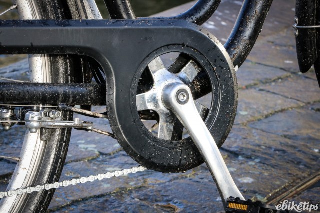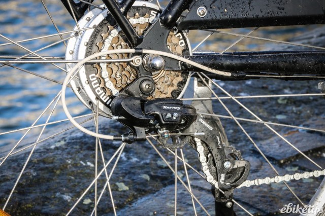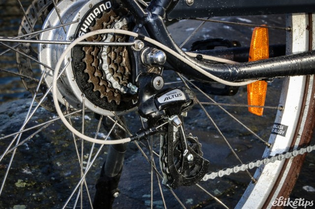 For £599 you're getting a decent spec: The Shimano Tourney 6-speed derailleur gears and alloy V-brakes work fine, and you're getting everthying you need for city riding as part of the package: chainguard, mudguards, integrated lights and a kickstand are all included. If you're after a cheap city bike that'll give you a bit of help on the hills, there's not many cheaper than this, and it's impressive considering what it costs.