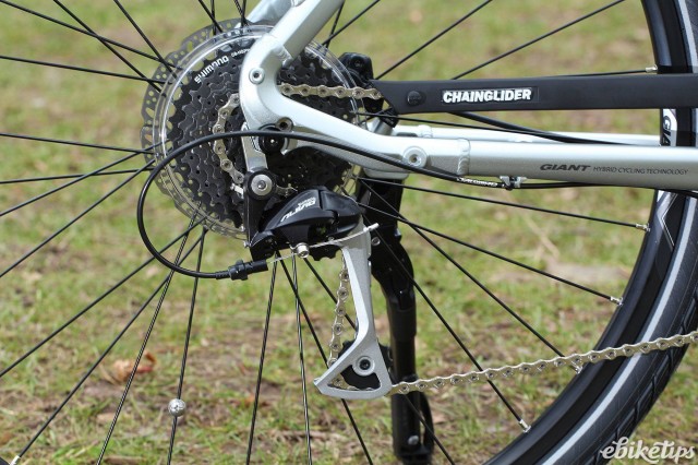 One of the highlights of the Prime E +3 was the manner in which the power was delivered. There are three modes: Eco, Normal and Sport. Eco and Normal are fairly close in terms of assistance, with a bigger jump to Sport which provides plenty of oomph for cresting any hills on route, or getting away from the lights. The power application is never choppy or unpredictable, there's plenty of power and it's evenly delivered. Hills are no problem: I managed most climbing in normal mode with the 9-speed derailleur setup providing plenty of gear range for even steep hills. Derailleur gears aren't always the best solution for town riding because the chain is often uncovered. Giant uses a chaincase that sits on top of the chain and moves with it across the cassette, as opposed to a fixed one. It's only on the top chain run but it's as effective as a half-chaincase would be on a hub-geared bike. There's a bit of chatter and noise from it but nothing too disturbing.
