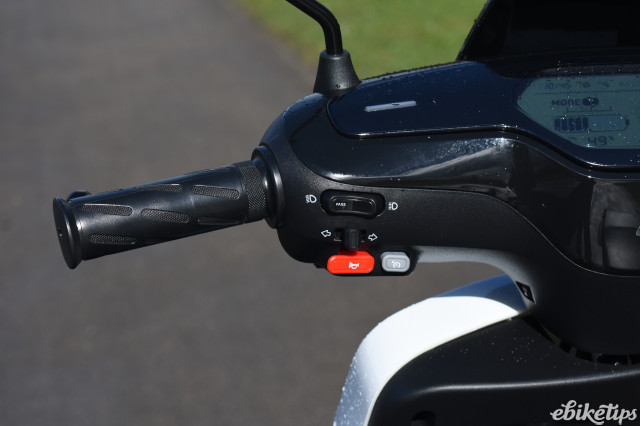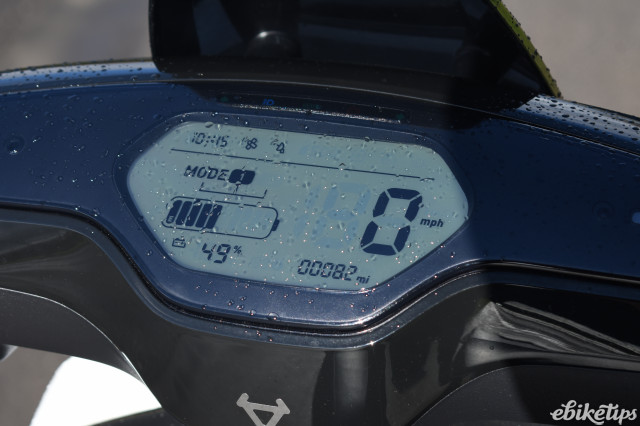 The main features on the LCD display are the battery charge indicator (battery bars and percentage) and the speedo. There's a mode indicator (mode 1 is a low speed 'get me home' setting and mode 2 full speed) and various icons at the top related to GPS functioning. Time and odometer are also clearly displayed. It's all large, clear and highly visible in all conditions.