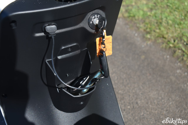Moving to the rear of the bike, there are retractable foot pegs and a grab rail should you want to take a small passenger. The seat easily flips up if you want to remove the battery, which has a carry handle, and the key 'ignition' can also be used to activate the steering lock for extra security when parked.