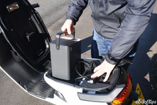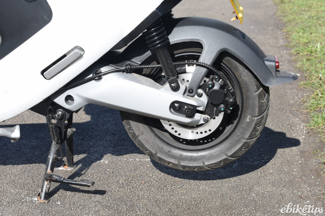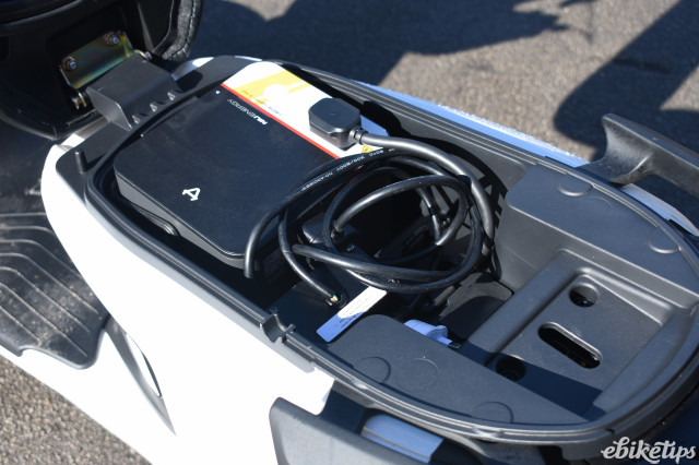 The cavity under the seat not only holds the battery, there is also space to slot the rather bulky 5 amp charger in there. There is also an optional helmet box that that can be affixed to the rear of the frame where it sits over the rear of the back wheel - that still just about leaves room for a small, light pillion passenger.