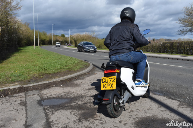 The MQi+ Sport felt as any good e-moped should in busy town traffic: lovely, quick acceleration off the mark to get clear of busy traffic at junctions and comfortable and stable on the open road. With that 28mph top speed limit it feels more secure in 20mph and 30mph zones than on roads with faster speed limits, where you can feel a bit exposed - though of course not as exposed to large traffic whooshing past as on a 15.5mph e-bike. The suspension soaks up potholes well and the brakes are effective. Overall it feels safe and stable in all conditions and corners very well on the grippy road tyres.