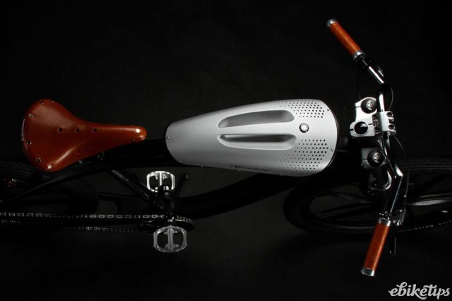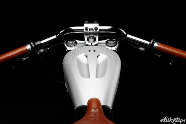 What are you getting for all that cash? Well, the bike has some interesting features. The battery (the silver bit on the top tube that looks like a fuel tank on this cafe-racer-inspired bike) is not just a battery but a multi-purpose unit. It has Bluetooth connectivity and integrated speakers, so it can stand on its own as a boombox streaming stuff from your smartphone. It even comes with its own natty leather strap. Look!
