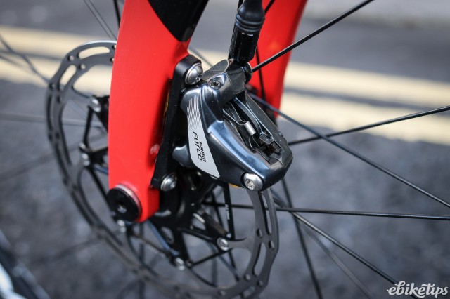 The Nytro is based on Pinarello’s Gan Disc, which is itself derived from the Tour-de-France-winning Dogma F8, so you’re getting some frame pedigree here. The F8 is a pure race bike, and the Gan was designed to be a bit more approachable: the geometry is a bit less aggressive and it uses lower grades of carbon fibre which sacrifice a little bit of the top-end stiffness but that makes the bike more comfortable to ride.