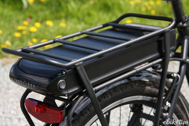 Roodog suggest you’d get 40 miles out of the battery. At 475Wh it’s a decent-sized unit, especially for the money. That sounds like a pretty realistic estimate for most people and if you live somewhere flat and you don’t weigh that much (or spend too much time in turbo mode) you’d probably surpass that. The battery itself feels well made and the rack it sits in will take a normal pannier. The rack-mounted battery puts the centre of gravity higher than bikes that mount the battery in the main triangle or behind the seat tube, which could be an issue if you don’t have lots of upper body strength.