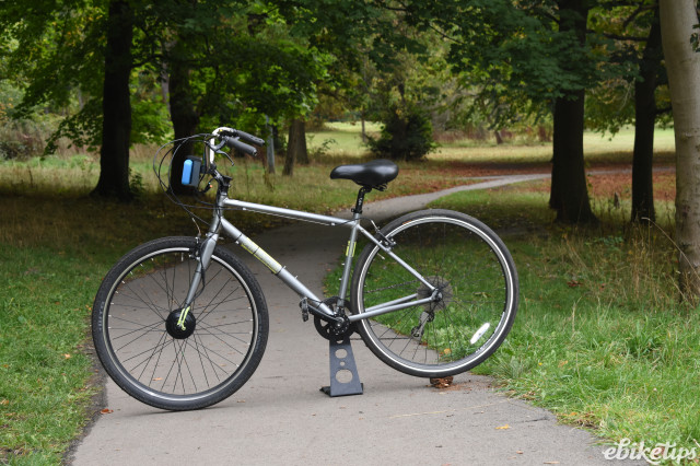 It was fitted to a Pinnacle hybrid with V-brakes - a decent quality bike from back in the days when V-brakes were the standard quality offering and discs more premium bike territory. The 'naked' weight before fitting was 12.1kg. After fitting it was 15.4kg, a net gain of 3.3kg, making it one of the lightest e-bike conversion kits out there - albeit that that is partly achieved by using such a small battery.