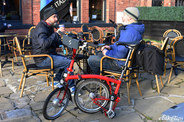 The Swytch kit was fitted to a Brompton C Line, a six gear option (three gears or even one gear would be fine for this route) with practical features such as mudguards and a front mounting block for a bag.