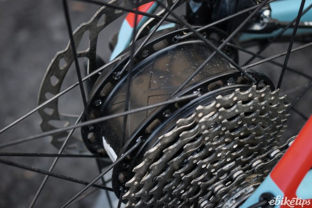 The ebikemotion motor on this bike is in the rear hub, and between the disc rotor and the cassette you'd barely notice it. Pretty much all the other bits on the bike are standard components. The battery is hidden in the downtube, and so it isn't immediately obvious that it's an e-bike. Most of my (non-cycling) friends where pretty surprised when I told them it had a motor. The motor system adds about 3.7kg to the bike overall.