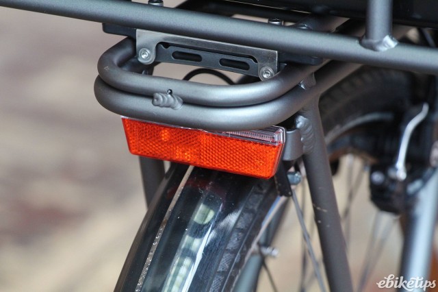 The eLoad is supremely practical in nearly every way. It has a sturdy double kickstand to keep it steady while you're loading it up with shopping, and a frame-mounted lock so you can keep it secure while you pop into shops. The Schwalbe Big Ben tyres on the 24" wheels roll well, give plenty of cushioning and are sturdy enough to shrug off intrusions from road debris. There's full mudguards too, so you don't get soaked by wheel spray when it's tipping down. The Busch and Muller front and rear lights are wired into the motor system so you can turn them on and off from the head unit. And the Magura HS11 hydraulic rim brakes (a continental favourite) do a great job of stopping the 30kg heft of the eLoad in short order, although the pads aren't especially long-lived. The Nexus hub gear gives a wide enough range of gears for pretty much anything this bike is likely to do and the gears are biased towards low speed as well, so there's plenty of climbing ratios.